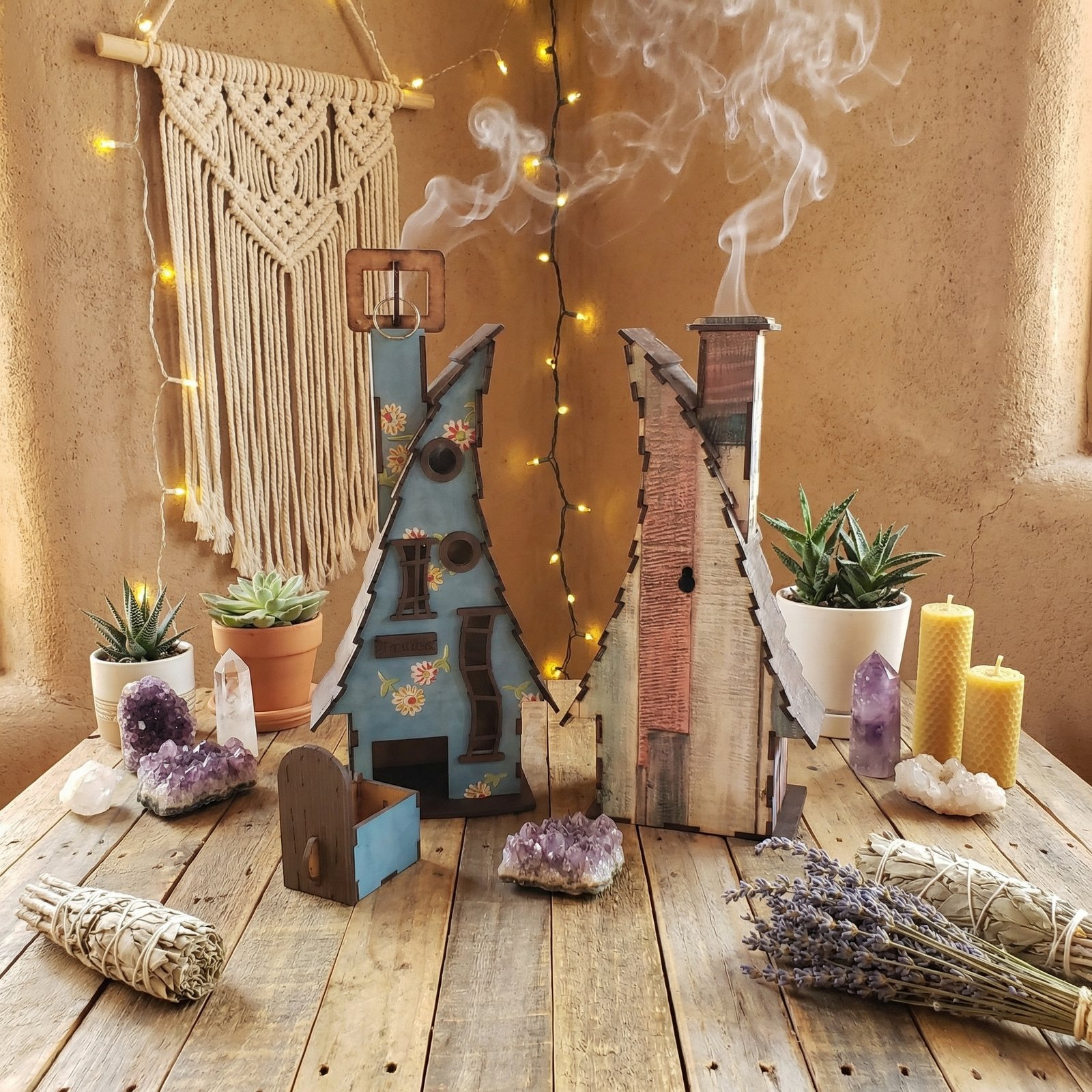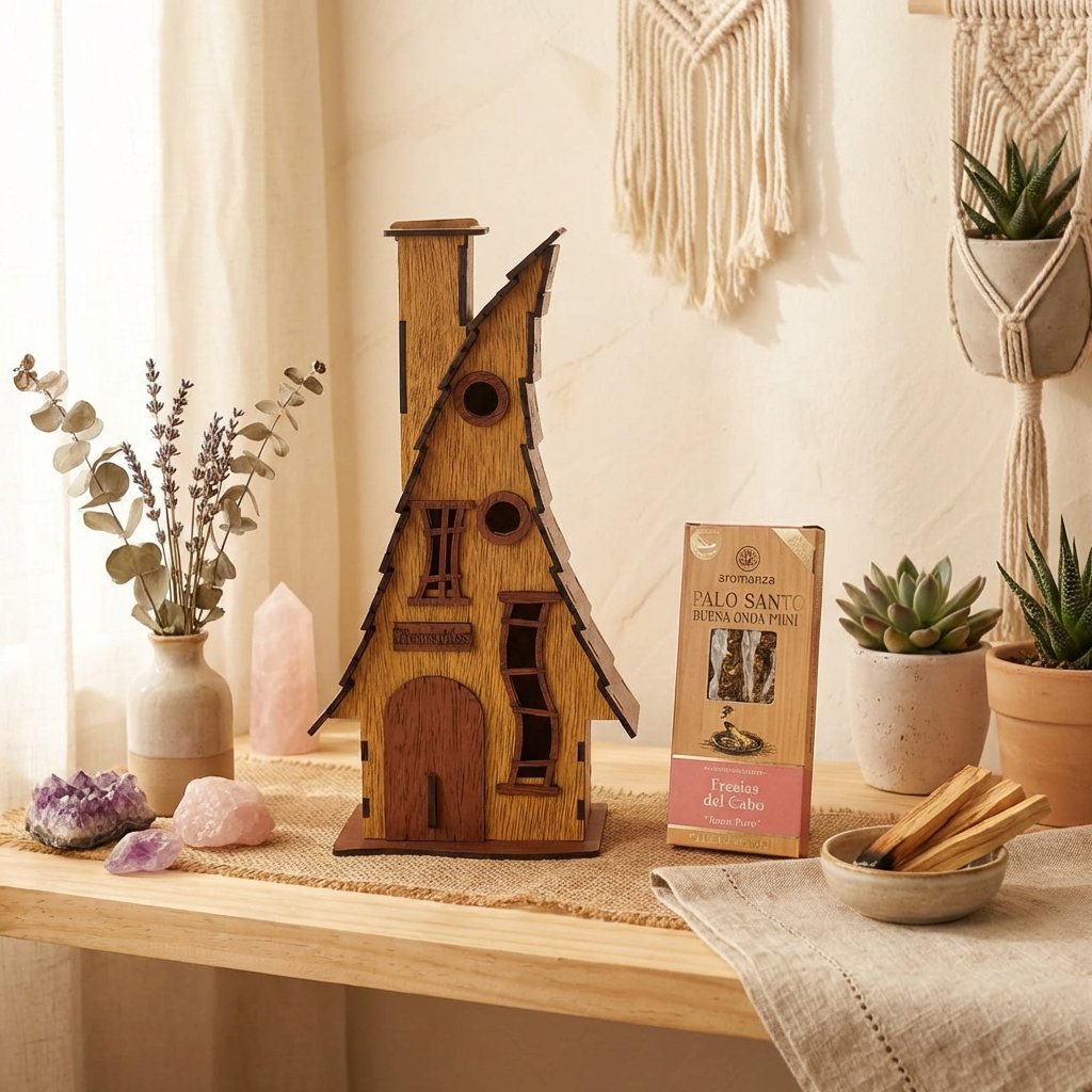 Porta sahumerio artesanal en madera con diseño arquitectónico único. Cada casita es una pieza funcional que transforma tu espacio en un altar personalizado. Con una caja de sahumerios de REGALO.